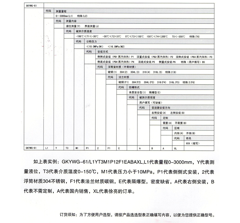 GKYWG-61電動(dòng)浮筒液位計(jì)是采用了國外技術(shù)及零部件研制組裝的新型液位測量儀表,該儀表搭載了先進(jìn)微型計(jì)算機(jī)系統(tǒng),除了具有高準(zhǔn)確度、低漂移等優(yōu)點(diǎn)外,還可對測量過程的溫度和密度進(jìn)行自動(dòng)補(bǔ)償,同時(shí)可調(diào)整量程范圍,適合多種工況的液位界位測量。本產(chǎn)品具有防爆性,結(jié)構(gòu)簡單,性能穩(wěn)定,安裝方便。可廣泛用于石油、化工、冶金、電力及鋼鐵行業(yè)。GKYWG-61型電動(dòng)浮筒液位計(jì)可用來測量液位、界位和密度,不但能輸出4~20mA的標(biāo)準(zhǔn)電流信號,也能利用HART通訊協(xié)議隨時(shí)讀取,對過程操作當(dāng)中用戶所需要的信息又可在傳輸線的任意一點(diǎn)對其進(jìn)行調(diào)校。
